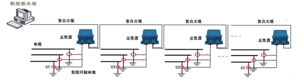 该系统通过安装在电缆接头接地引出线或交叉互连线上的高频脉冲电流传感器,来耦合局部放电脉冲电流信号;采用工频相位互感器耦合电缆本体的工频信号,用于同步监测装置;通过安装在电缆接头接地引出线或交叉互连线上的电流互感器,来获取接地线上电流的大小;温度传感器(无线无源温度传感器/探头式温度传感器)及视频摄像机对运行中的电缆本体进行实时温度监测;气体传感器监测电缆隧道中的有害气体浓度(O2、CO、CH4、H2S),耦合到的信号通过信号线传送至监测装置,对模拟信号经过放大、模数转换后变成数字信号再传送至监测主机。该系统通过 4G 无线通讯方式将数据传送至后台服务器,兼容物联网 MQTT 协议,CT 取电方式。