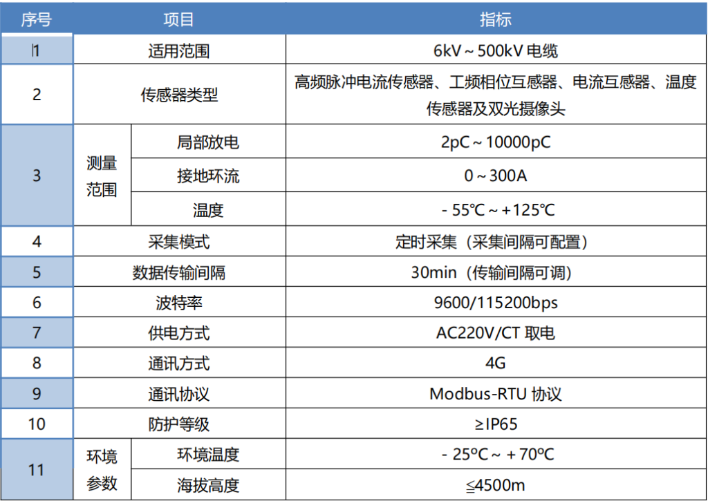 系统最小测量放电幅值:2pC,脉冲电流传感器的频率范围为 1M~100MHz;电流互感器测量范围 0~300A;温度传感器灵敏度为±0.5℃,温度测量范围为-55℃~+125℃;双光摄像头采用热成像及可见光技术,测温精度为±2℃/读数的 2%。